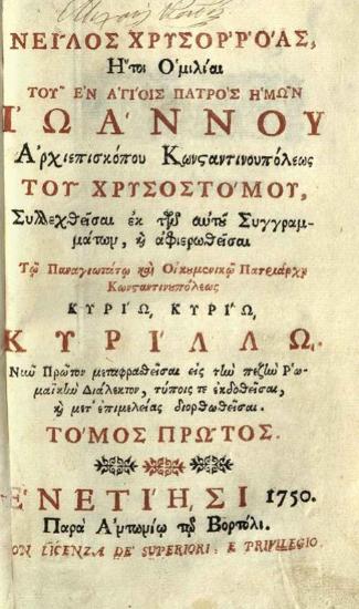 Ἰωάννης Χρυσόστομος. Νεῖλος Χρυσορρόας Ἤτοι Ὁμιλίαι τοῦ ἐν Ἁγίοις Πατρὸς Ἡμῶν Ἰωάννου... Κωνσταντινουπόλεως... μεταφρασθεῖσαι εἰς τὴν πεζὴν ῾Ρωμαϊκὴν Διάλεκτον..., τ. Α´, Βενετία, Ἀντώνιος Βόρτολις, 1750.