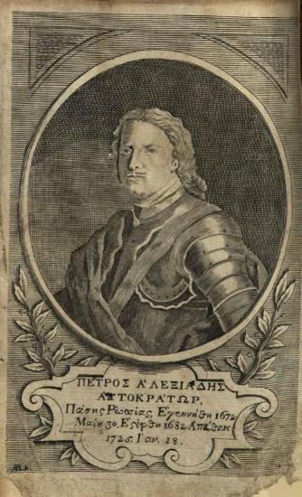 [Ἀθανάσιος Σκιαδᾶς]. Γένος, Ἦθος Κίνδυνοι καὶ Κατορθώματα Πέτρου τοῦ Πρώτου... Αὐτοκράτορος... ῾Ρωσίας..., Βενετία, Ἀντώνιος Βόρτολις, 1737.