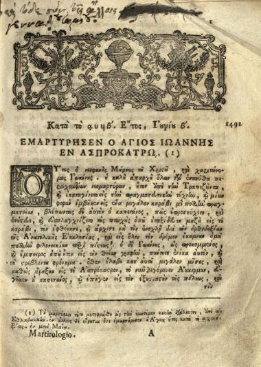[Νικόδημος Ἁγιορείτης]. Νέον Μαρτυρολόγιον ἤτοι μαρτυρία τῶν νεοφανῶν μαρτύρων τῶν μετὰ τὴν ἅλωσιν τῆς Κωνσταντινουπόλεως..., Βενετία, Νικόλαος Γλυκύς, 1799.