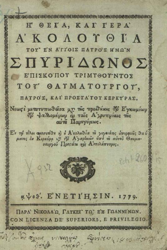 Ἡ Θεία καὶ Ἱερὰ Ἀκολουθία τοῦ ἐν ἁγίοις... Σπυρίδωνος... καὶ ἡ Ἀκολουθία τοῦ... θαύματος ἐν Κερκύρᾳ..., Βενετία, Νικόλαος Γλυκύς, 1779.