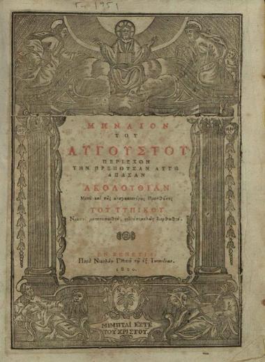 Μηναῖον τοῦ Αὐγούστου..., Βενετία, Νικόλαος Γλυκύς, 1820.