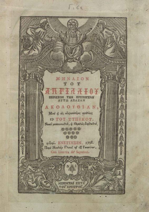 Μηναῖον τοῦ Ἀπριλλίου..., Βενετία, Νικόλαος Γλυκύς, 1798.