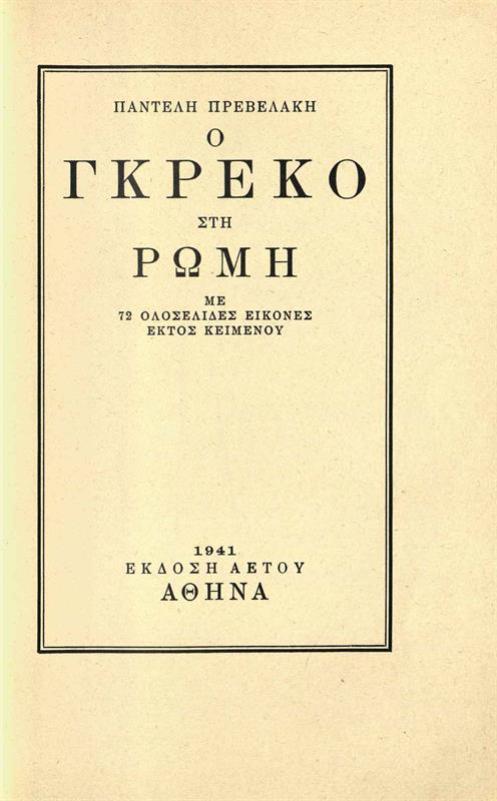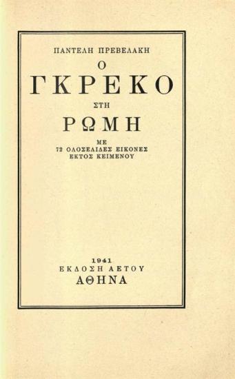 Παντελὴς Πρεβελάκης, Ὁ Γκρέκο στὴ Ρώμη μὲ 72 ὁλοσέλιδες εἰκόνες ἐκτὸς κειμένου, Ἐκδόσεις Ἀετοῦ, Ἀθήνα 1941.