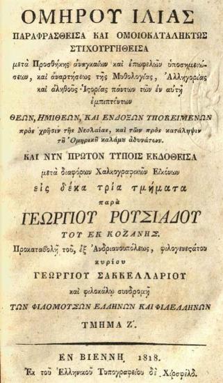 Ὁμήρου Ἰλιὰς παραφρασθεῖσα καὶ ὁμοιοκαταλήκτως στιχουργηθεῖσα... παρὰ Γεωργίου Ρουσιάδου..., Βιέννη, Ἑλληνικὸ Τυπογραφεῖο δὲ Χίρσφελδ, τ. Α´-Δ´, 1817, τ. Ε´-Ζ´, 1818, τ. Η´-ΙΓ´, 1819.