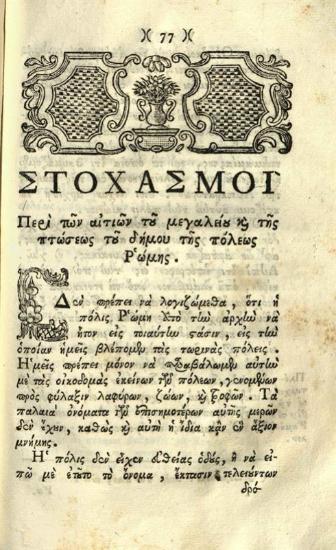 Βιβλίον... εἰς μέρη δύω... πρῶτον... διακρίσεις εἰς τὸ ποίημα... Βολτὲρ... δεύτερον Στοχασμοὺς... περὶ τῶν αἰτιῶν τοῦ μεγαλείου καὶ τῆς πτώσεως... τῆς ῾Ρώμης..., Βενετία, Πάνος Θεοδοσίου, 1796.