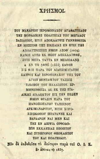 Χρησμοὶ τοῦ Ἀγαθαγγέλου, Ἀθήνα, ἐκ τῆς Τυπογραφίας Ἀνδρέου Κορομηλᾶ, 1837.