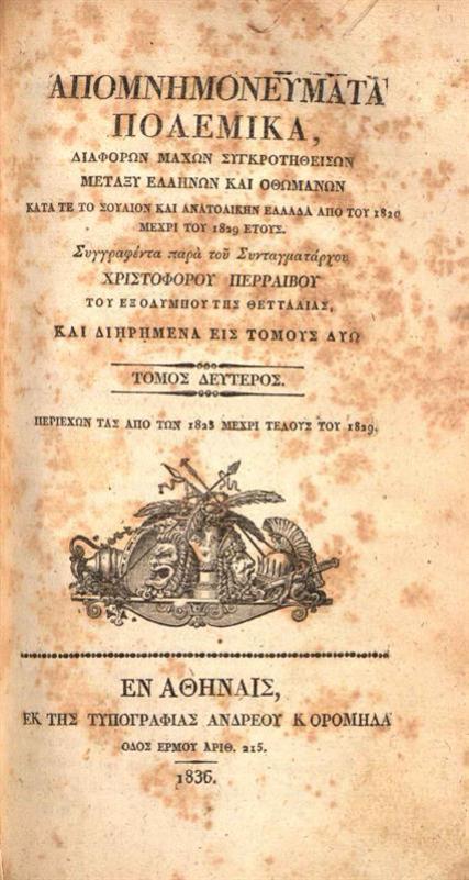 Χριστόφορος Περραιβός, Ἀπομνημονεύματα πολεμικά, Ἀθήνα, Τυπογραφία Ἀνδρέου Κορομηλᾶ, τ. Α΄-Β΄, 1836.