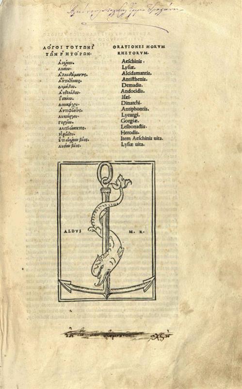 Λόγοι τουτωνὶ τῶν ῾Ρητόρων. Αἰσχύνου. Λυσίου. Ἀλκιδάμαντος. Ἀντισθένους. Δημάδου. Ἀνδοκίδου. Ἰσαίου. Δεινάρχου. Ἀντιφῶντος. Λυκούργου. Γοργίου. Λεσβώνακτος. Ἡρώδου. Ἔτι Αἰσχύνου βίος. Λυσίου βίος, Βενετία, Ἄλδος Μανούτιος, Μάιος 1513.