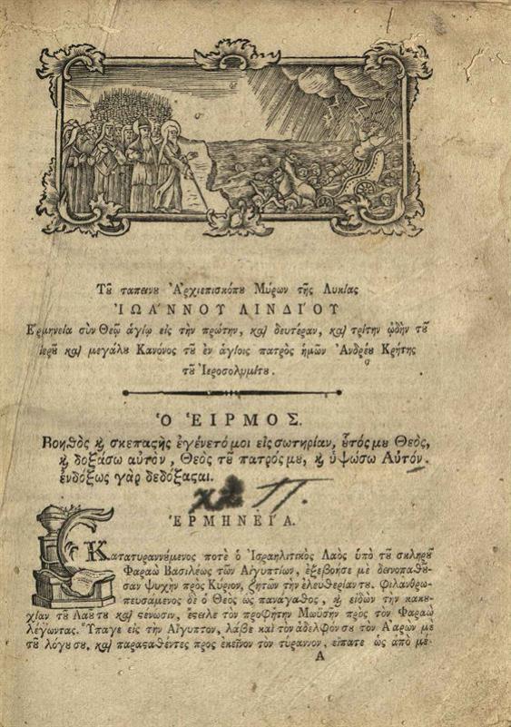 Ἰωάννης ὁ ἐκ Λίνδου. Ἑρμηνεία τοῦ... Κανόνος τοῦ... Ἀνδρέου ἀρχιεπισκόπου Κρήτης..., τ. Α´, Βιέννη, Μαρκίδες Πούλιοι, 1796.