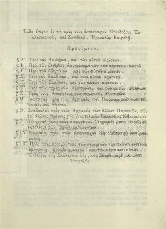 Γρηγόριος ΣΤ΄, Πατριάρχης Κωνσταντινουπόλεως. Ἐγκύκλιος ἐκκλησιαστικὴ καὶ Συνοδικὴ ἐπιστολή, Παραινετικὴ πρὸς τοὺς ἁπανταχοῦ Ὀρθοδόξους εἰς ἀποφυγὴν τῶν ἐπιπολαζουσῶν ἑτεροδιδασκαλιῶν..., Κωνσταντινούπολη, παρὰ Α. Ἀργυράμμῳ, 1836.