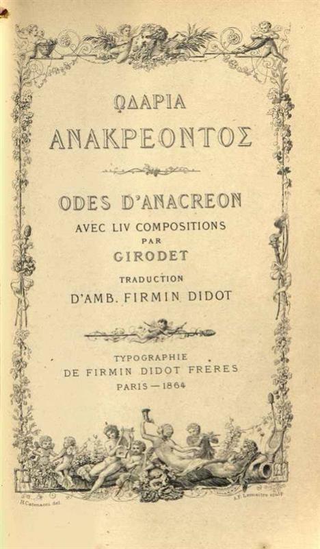 Ἀνακρέων. Ὠδάρια Ἀνακρέοντος. Odes d’Anacreon avec LIV compositions par Cirodet, traduction d’Amb. Firmin Didot..., Παρίσι, Typographie de Firmin Didot frères, 1864.