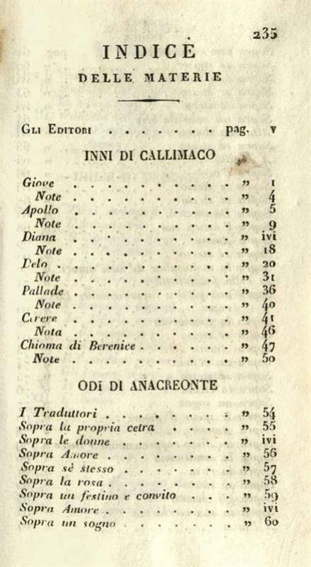 Καλλίμαχος - Ἀνακρέων - Σαπφὼ - Θεόκριτος - Μόσχος - Βίων. Biblioteca Universale di scelta letteratura antica e moderna..., Μιλάνο, per Nicolò Bettoni, 1827.