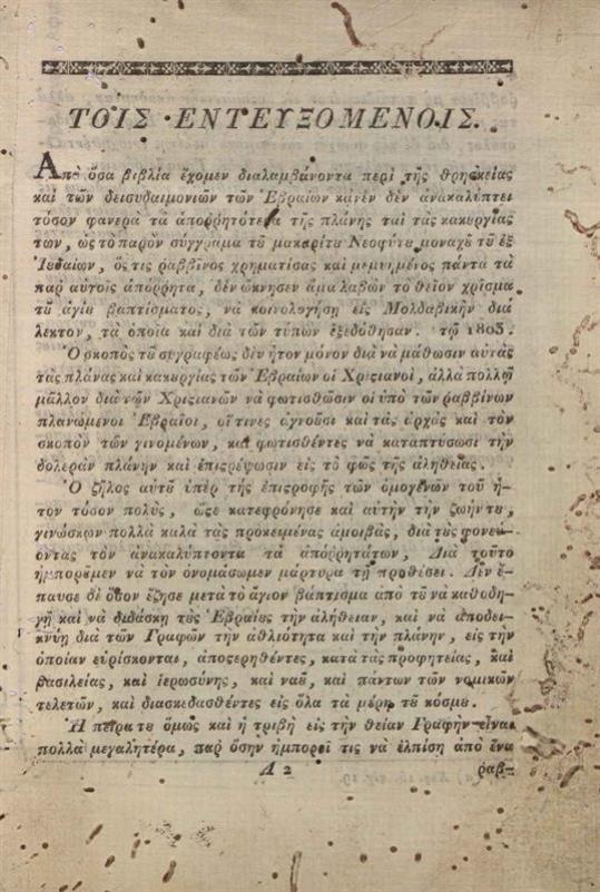 [Νεόφυτος ἐξ Ἰουδαίων, μοναχός]. Ἀνατροπὴ τῆς Θρησκείας τῶν Ἑβραίων καὶ τῶν ἐθίμων αὐτῶν... μεταφρασθεῖσα ἐκ τῆς Μολδαβικῆς... ὑπὸ Ἰωάννου Γεωργίου... [Ἰάσιο, Ἑλληνικὴ Τυπογραφία], 1818.