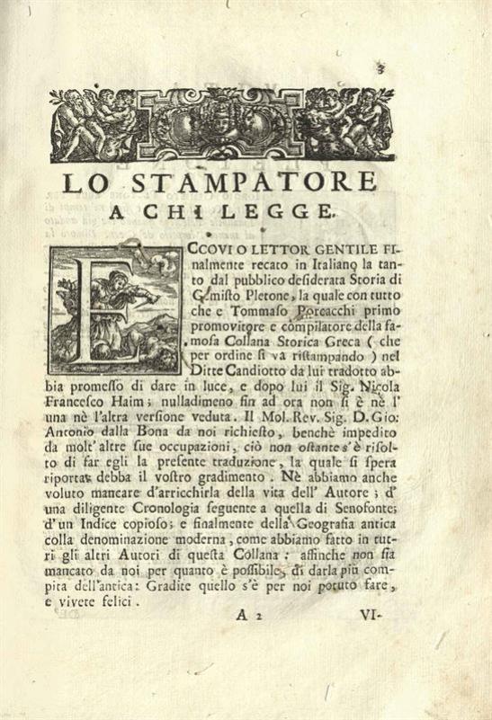 Γεώργιος Γεμιστός, Πλήθων. Giorgio Gemisto Pletone Dell’Istorie de’Greci... tradotto in italiano Dal... Antonio Dalla Bona..., Βερόνα, Dionigi Ramanzini, 1736.