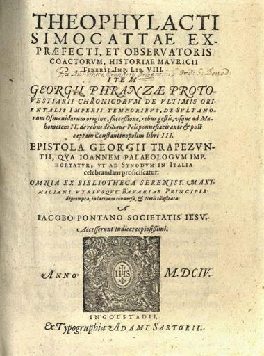 Θεοφύλακτος Σιμοκάττης. Theophylacti Simocattae... Historiae Mauricii... Georgii Phranzae... Chronicorum... À Iacobo Pontano Societatis Iesu..., Ingolstadt, ex Typographia Adami Sartorii, 1604.