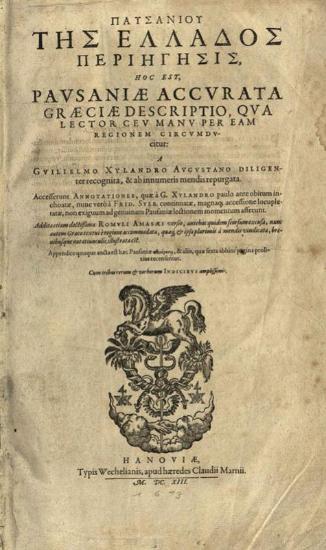 Παυσανίας. Παυσανίου τῆς Ἑλλάδος περιήγησις... A Guilielmo Xylandro Augustano..., Ἀννόβερο, Typis Wechelianis, apud haeredes Claudii Marnii, 1613.
