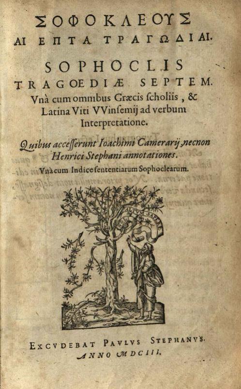 Σοφοκλῆς. Σοφοκλέους Αἱ Ἑπτὰ Τραγωδίαι. Sophoclis Tragoediae Septem... Ioachimi Cameranij, necnon Henrici Stephani annotationes..., Paulus Stephanus (Paul Estienne), 1603.