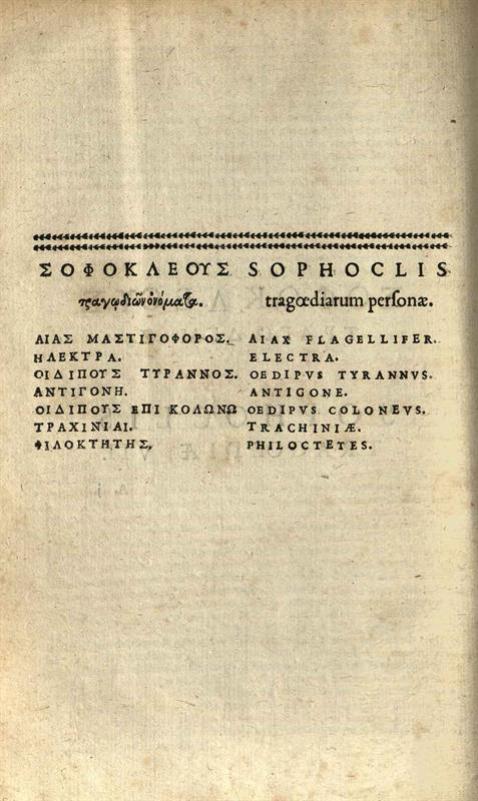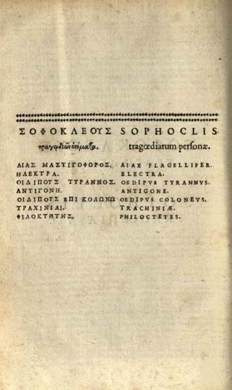 Σοφοκλῆς. Σοφοκλέους Αἱ Ἑπτὰ Τραγωδίαι. Sophoclis Tragoediae Septem... Ioachimi Cameranij, necnon Henrici Stephani annotationes..., Paulus Stephanus (Paul Estienne), 1603.