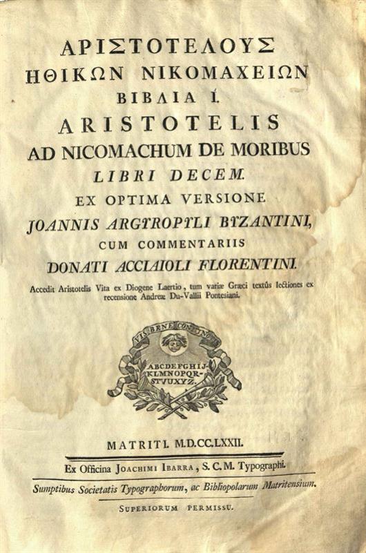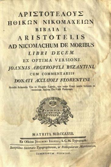 Ἀριστοτέλης. Ἀριστοτέλους Ἠθικῶν Νικομαχείων Βιβλία Ι..., Μαδρίτη, ex officina Joachimi Ibarra, 1772.