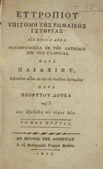 Νεόφυτος Δούκας. Λεξικὸν τῶν ἐνδόξων ἀνδρῶν τῶν ἐν τῇ Ἱστορίᾳ τοῦ Εὐτροπίου, τ. Β´ Βιέννη, Ἰωάννα Σχραίμβλ, 1807.