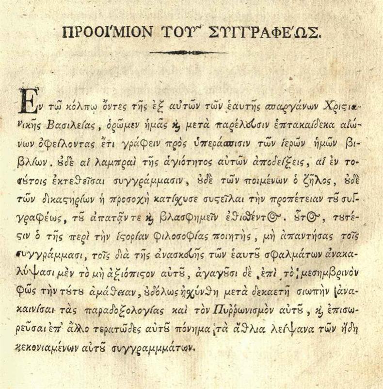 [Joseph Guillaume Clémence]. Ἀπόδειξις τοῦ κύρους τῶν τῆς Νέας καὶ Παλαιᾶς Διαθήκης Βιβλίων... ἢ Ἀνασκευὴ τῆς τοῦ Βολτέρου βίβλου... μεταφρασθεῖσα [ὑπὸ Νικηφόρου Θεοτόκη]..., Βιέννη, Μαρκ. Πούλιου, 1794.
