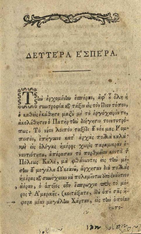 [Ioachim Heinrich Campe]. Τοῦ νέου Ρομπινσὸν συμβάντα... μεταφρασθέντα παρὰ Κωνσταντίνου Δημητρίου Μπέλιου..., Βιέννη, Γεώργιος Βεντότης, τ. Α´-Β´, 1792.