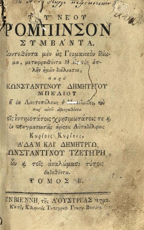 [Ioachim Heinrich Campe]. Τοῦ νέου Ρομπινσὸν συμβάντα... μεταφρασθέντα παρὰ Κωνσταντίνου Δημητρίου Μπέλιου..., Βιέννη, Γεώργιος Βεντότης, τ. Α´-Β´, 1792.