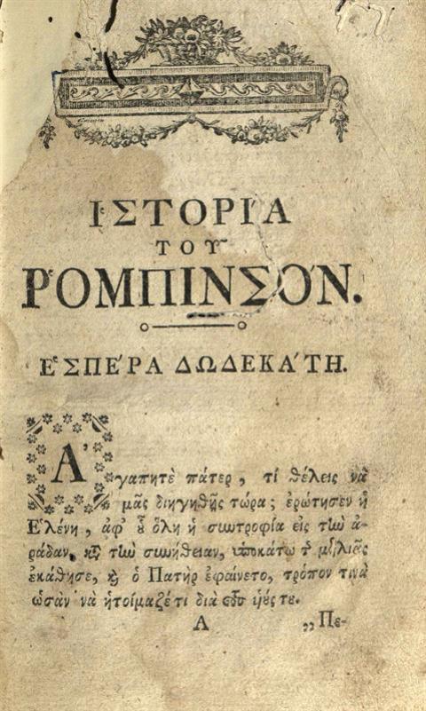 [Ioachim Heinrich Campe]. Τοῦ νέου Ρομπινσὸν συμβάντα... μεταφρασθέντα παρὰ Κωνσταντίνου Δημητρίου Μπέλιου..., Βιέννη, Γεώργιος Βεντότης, τ. Α´-Β´, 1792.
