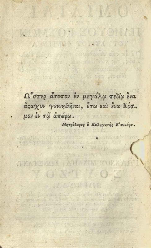 Φοντενέλ (Bernard Le Bovier de Fontenelle). Ὁμιλίαι περὶ πληθύος κόσμων... Μεταφρασθεῖσα... παρὰ Παναγιωτάκη Καγκελλαρίου Κοδρικᾶ..., Βιέννη, Γεώργιος Βεντότης, 1794.