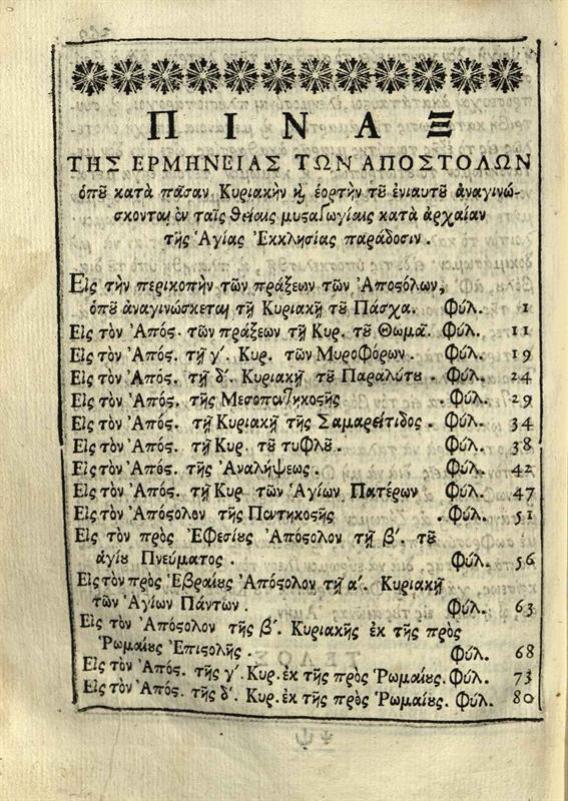 Ἰωάννης Χρυσόστομος. Ἐξήγησις τῶν κατὰ πᾶσαν Κυριακὴν ἀναγνωσμάτων τῶν ἐκ τῶν Ἱερῶν Πράξεων τῶν... Ἐπιστολῶν... Παύλου. Μεταφρασθέντων ἐκ τῶν... τοῦ... Ἰωάννου τοῦ Χρυσοστόμου... καὶ δύο λόγοι τοῦ αὐτοῦ..., Κωνσταντινούπολη, Τυπογραφεῖο Πατριαρχείου Κωνσταντινουπόλεως, 1807.