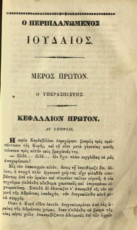 Εὐγένιος Σύη. Ὁ Περιπλανώμενος Ἰουδαῖος, Μυθιστορία εἰς δέκα τόμους... Μεταφρασθεῖσα... ὑπὸ Γεωργίου Δ. Ροδοκανάκη..., τ. 6, Σμύρνη, Τυπογραφεῖον τοῡ Περιπλαν. Ἰουδαίου, 1846.