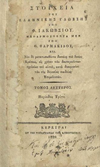 Φ. Ἰακώβσιος (Friedrich Jacobs). Στοιχεῖα τῆς ἑλληνικῆς γλώσσης... μεθαρμοσθέντα ὑπὸ Θ. Φαρμακίδου..., τ. Β´, Κέρκυρα, Τυπογραφία τῆς Κυβερνήσεως, 1829.
