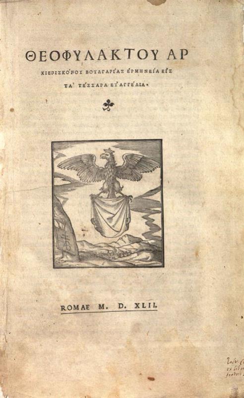 Θεοφύλακτος Βουλγαρίας. Θεοφυλάκτου Ἀρχιεπισκόπου Βουλγαρίας Ἑρμηνεία εἰς τὰ τέσσερα Εὐαγγέλια..., Ρώμη [A. Blado], 1542.