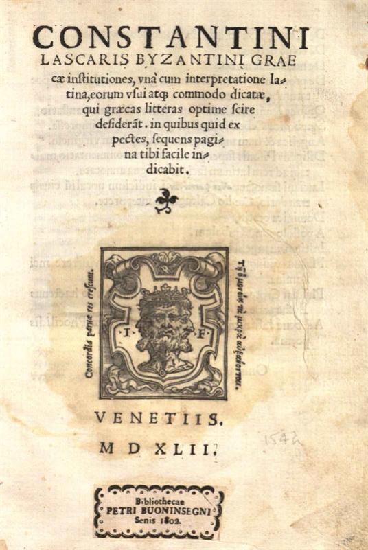 Κωνσταντῖνος Λάσκαρης. Constantini Laskaris Byzantini Graecae institutiones..., Βενετία, Giovanni Farri & fratres, 1542.