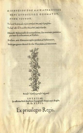 Διονύσιος Ἁλικαρνασσεύς. Διονυσίου τοῦ Ἁλικαρνασσέως Ρωμαϊκῆς Ἀρ-χαιολογίας Βιβλία Δέκα..., Παρίσι, ex officina Rob. Stephani, Φεβρουάριος 1546.