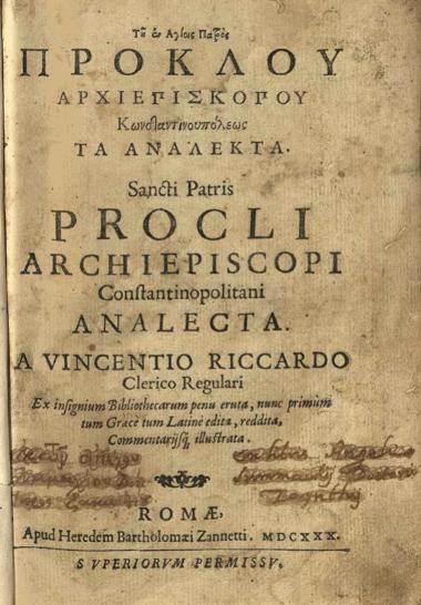 Πρόκλος. Τοῦ ἐν Ἁγίοις Πατρὸς Πρόκλου Ἀρχιεπισκόπου Κωνσταντινουπόλεως Τὰ Ἀνάλεκτα..., Ρώμη, apud haeredem Bartholomaei Zannetti, 1630.