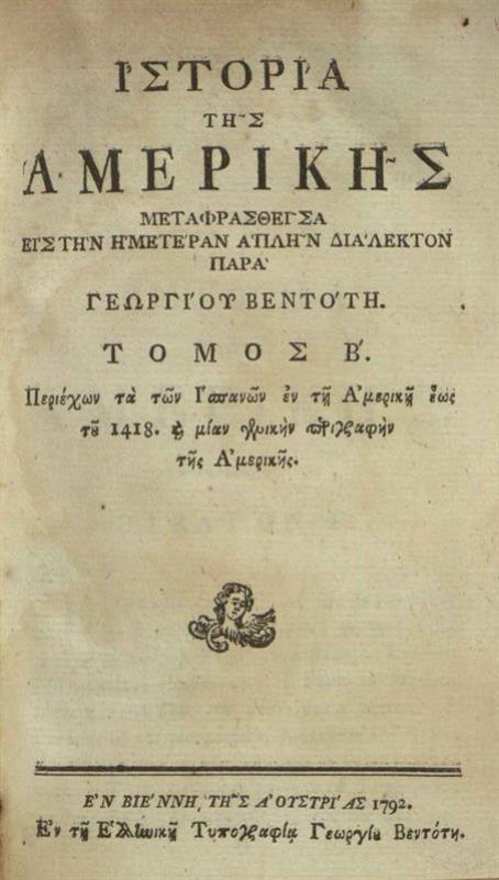 [William Robertson]. Ἱστορία τῆς Ἀμερικῆς μεταφρασθεῖσα... Παρὰ Γεωργίου Βεντότη..., Βιέννη, Γεώργιος Βεντότης, τ. Α´-Β´, 1792, τ. Γ´-Δ´, 1794.