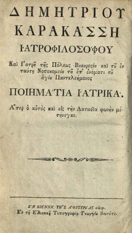 Δημήτριος Καρακάσσης. Ποιημάτια Ἰατρικὰ... καὶ εἰς τὴν Λατινίδα φωνὴν..., Βιέννη, Γεώργιος Βεντότης, 1795.