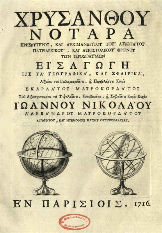 Χρύσανθος Νοταρᾶς. Χρυσάνθου Νοταρᾶ... Εἰσαγωγὴ εἰς τὰ Γεωγραφικά, καὶ Σφαιρικὰ..., Παρίσι [= Βενετία, Α. Βόρτολις], 1716.
