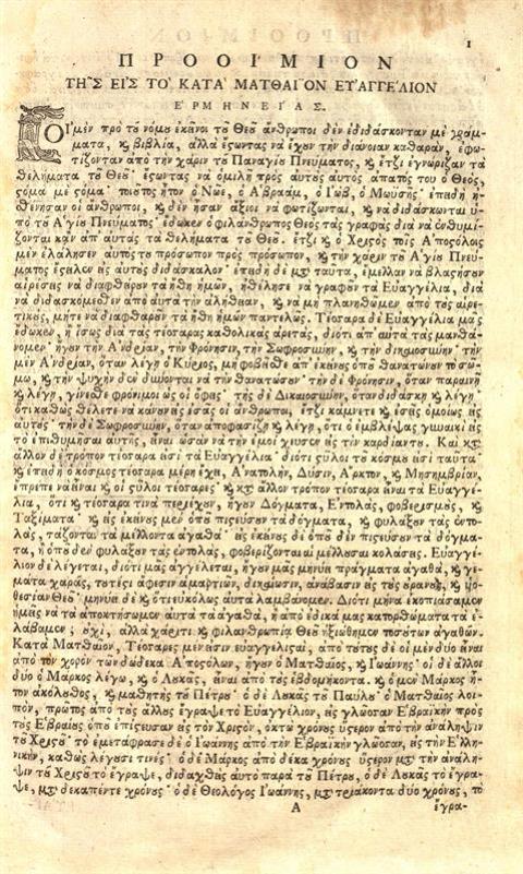 Θεοφύλακτος Βουλγαρίας, Θεοφυλάτου [sic] --- Ἑρμηνεία εἰς τὰ τέσσερα Ἱερα Ευαγγέλια, μεταγλωτισθεῖσα εἰς ἁπλῆν Φράσιν παρά τινος --- Ἀνωνύμου ---, Βενετία, Πάνος Θεοδοσίου, 1802.