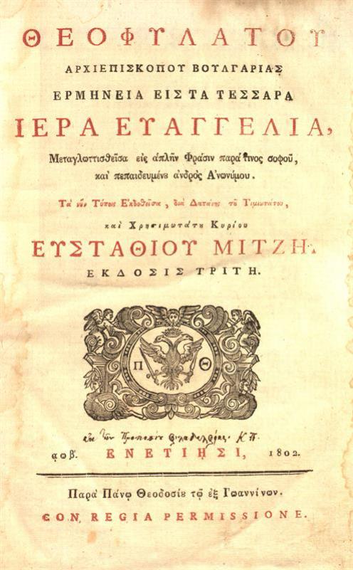 Θεοφύλακτος Βουλγαρίας, Θεοφυλάτου [sic] --- Ἑρμηνεία εἰς τὰ τέσσερα Ἱερα Ευαγγέλια, μεταγλωτισθεῖσα εἰς ἁπλῆν Φράσιν παρά τινος --- Ἀνωνύμου ---, Βενετία, Πάνος Θεοδοσίου, 1802.