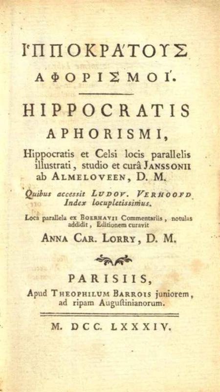 Ἱπποκράτης. Ἱπποκράτους Ἀφορισμοὶ... studio et curâ Jansonii ab Almeloveen... Ludov. Verhoofd Index... curavit Anna Car. Lorry..., Παρίσι, Theophilus Barrois, 1784.