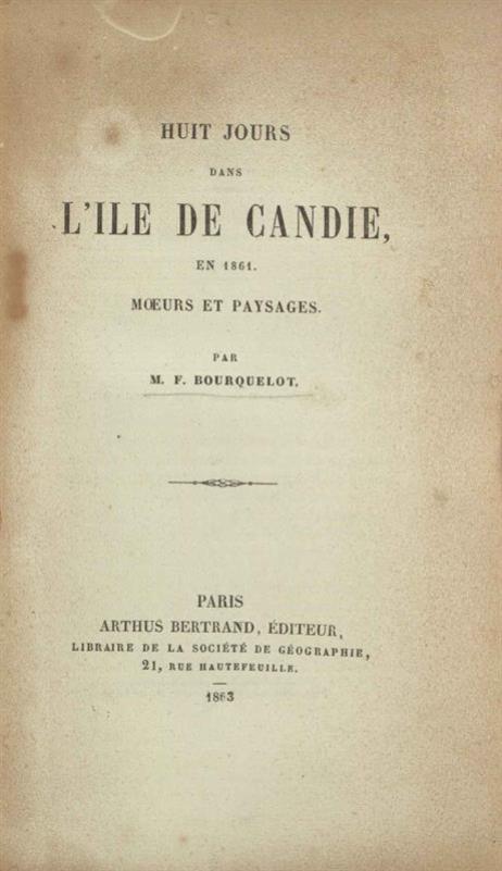 F. Bourquelot, Huit jours dans l’ile de Candie, en 1861. Mœurs et paysages ---, Παρίσι, Arthus Bertrand, 1863.