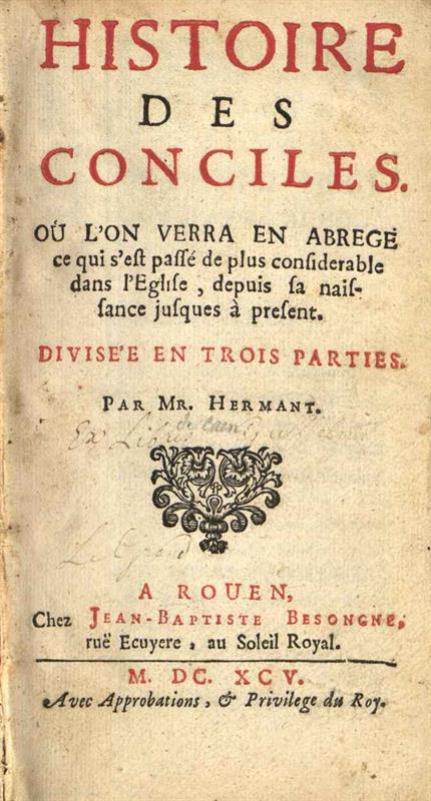 Jean Hermant. Histoire des Conciles. Ou l’on verra en abregé ce qui s’est passé de plus considerable dans l’Eglise depuis sa naissance jusque à present, Ρουέν, Jean-Baptiste Besongne, 1695.