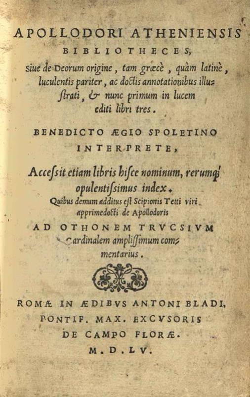 Ἀπολλόδωρος. Apollodori Atheniensis Bibliotheces... Benedicto Aegio Spoletino Interprete..., Ρώμη, Antonio Blado, 1555.