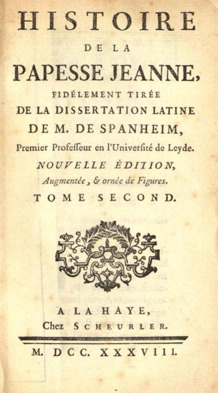 M. de Spanheim. Histoire de la Papesse Jeanne fidélement tirée de la dissertation latine…, La Haye, Chez Scheuzler, 1738.
