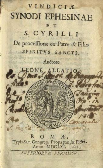 Λέων Ἀλλάτιος. Vindiciae Synodi Ephesinae et S. Cyrilli De processione ex Patre et Filio Spiritus Sancti..., Ρώμη, Typis Sac. Congreg. de Propagandae Fidei, 1661.