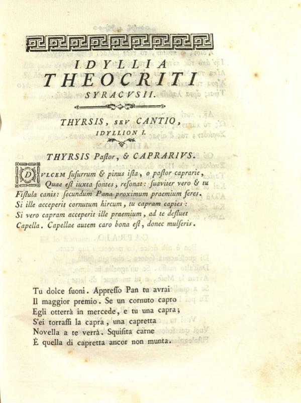 Θεόκριτος - Μόσχος - Βίων - Βιργίλιος. Simmia Greco-latini con la Buccolica di Virgili Latino-Graeca volgarizzati... da Eritisco Pilenejo..., τ. Α´, Πάρμα, Dalla Stamperia Reale, 1780.