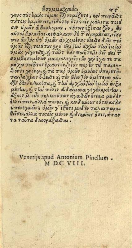 Ἰσοκράτης. Isocratis Orationes tres cum interpretatione Latina..., Βενετία, Sebastianus de Cumbis, 1608.