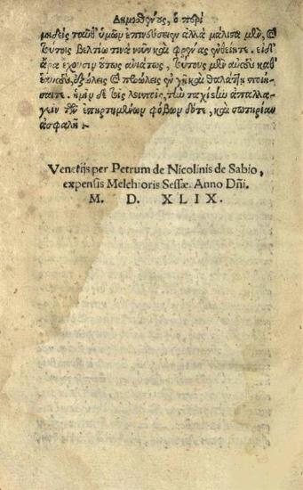 Αἰσχίνης - Δημοσθένης. Τῶν τῆς Ἑλλάδος ἐξόχων ῾Ρητόρων αἰσχίνου & δημοσθένους, λόγοι ἀντίπαλοι..., Βενετία, Πέτρος de Nicolini da Sabio, γιὰ λογαριασμὸ τοῦ Melchior Sessa, 1549.